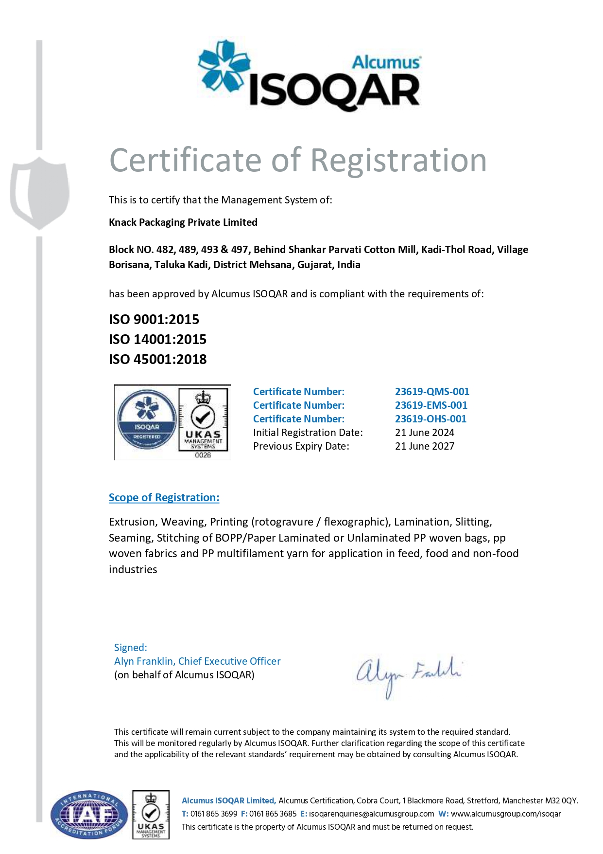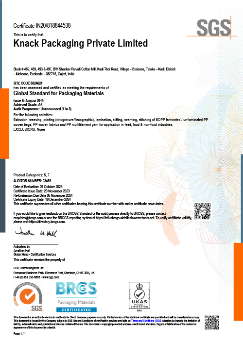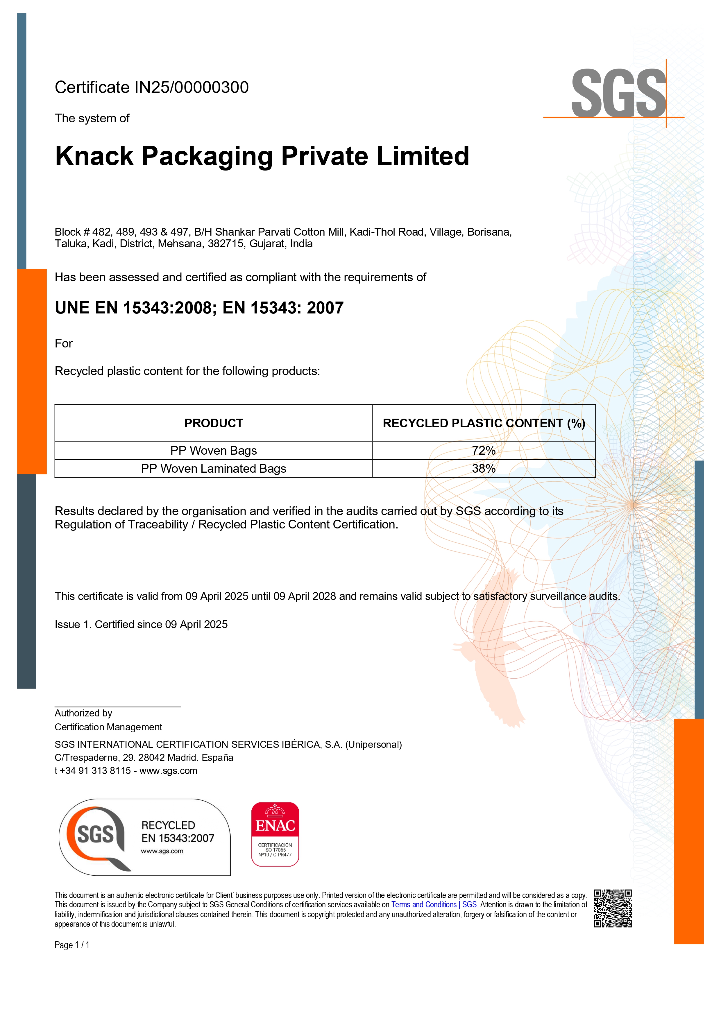 Knack Packaging holds full certification under EN 15343:2007 and EN 15343:2008, the European standards for traceability and conformity assessment of recycled plastics. This accreditation covers every stage from post-consumer feedstock intake through to finished product with independent audits ensuring transparent control of material flows and verification of recycled-content claims. Within this certified system, our PP Woven Bags contain 72% mechanically recycled polypropylene, and our PP Woven Laminated Bags incorporate 38% recycled content. We partner with accredited recyclers and maintain stringent in-process controls, including spectroscopic analysis and melt-flow testing, to ensure that performance matches virgin-grade equivalents. Maintaining EN 15343 certification underscores our dedication to sustainable manufacturing and circular-economy principles. It provides customers with verifiable environmental credentials and drives ongoing investments in advanced recycling technologies to raise recycled-content thresholds and further reduce our carbon footprint.